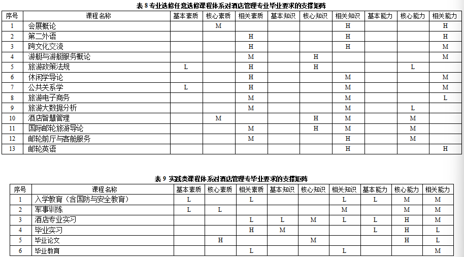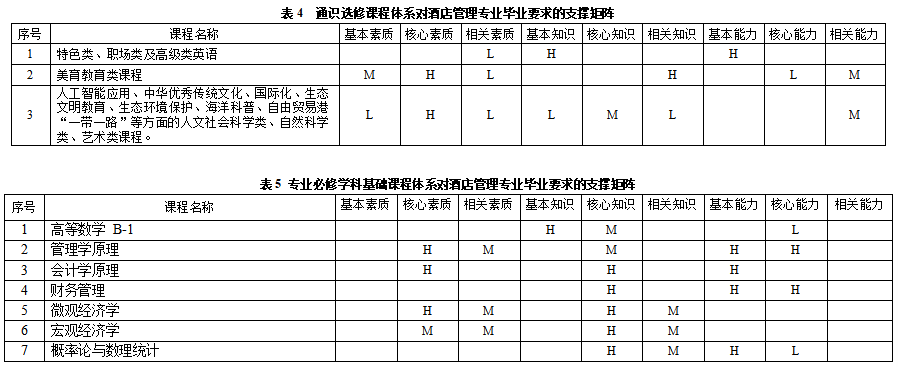 本专业员工基础能力要求为具备较熟练的外语沟通和国际交流能力,熟悉现代办公软件的使用。核心能力要求为掌握酒店经营管理的基本能力,如前厅服务与管理知识与能力、客房服务与管理知识与能力、餐饮服务与管理知识与能力、酒店营销与策划知识与能力等;具备酒店基层岗位的实践操作能力;掌握服务场景下的国际交流礼仪规范;具有一定的酒店产品创新能力;具有初步的科学研究工作能力,具有良好的自我心理调节能力和抗压能力。相关能力要求为具有一定的创新思维能力;具有一定的探索精神和创业能力。