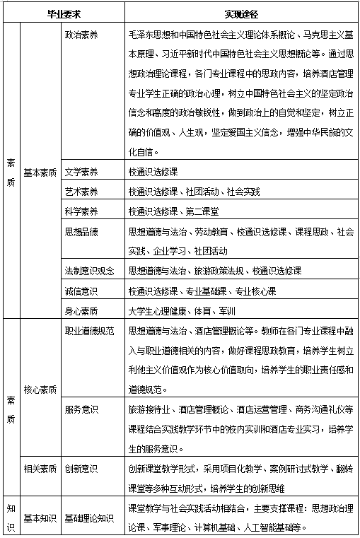 本专业员工基础素质要求为具有良好的政治素养和道德水平,热爱祖国,拥护中国共产党的领导;理解毛泽东思想、邓小平理论、三个代表重要思想、科学发展观、习近平新时代中国特色社会主义思想;具有集体主义、爱国主义思想;遵纪守法,有良好的思想品德、社会公德;具有一定的文学、艺术修养和人文科学素养;具有良好的世界观、人生观、价值观以及社会责任感。核心素质要求为具有良好的职业道德,较强的敬业精神和创新精神,具备较强的社交沟通能力、组织协调能力,优秀的服务意识,具备国际化酒店服务与管理标准化职业素养。相关素质为具有优良的人文素质和创新精神;良好的语言表达能力及与人沟通、共事的能力;具有吃苦耐劳、不屈不挠的人格品质。