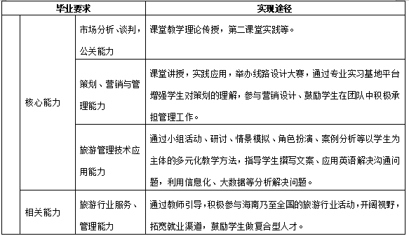 本专业根据“海南国际旅游岛”、“海南自贸港建设”的需求,充分利用海南旅游业的产业发展优势,“立足海南、服务南海”,坚持“知识、技能、素养”并重的教育模式,培养具有国际视野、人文素养、服务意识、创新创业精神;具备管理能力、实践能力和社会责任感的旅游管理专业中高端人才。发挥热带海洋旅游特色,突出“旅游+、+旅游”产业融合趋势,推动旅游学科与其它学科的交叉、渗透与融合,努力发展成为服务海南自由贸易港的旅游管理中高端人才培养基地。本专业员工毕业后五年预期成为旅游行业管理骨干。具体培养目标如下: