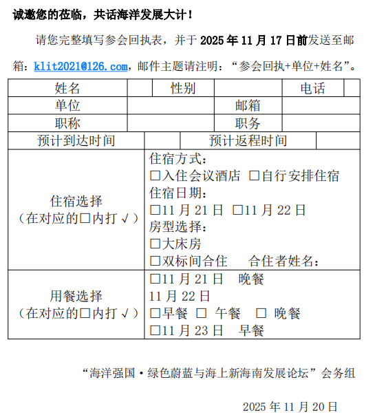 欢迎围绕会议主题撰写学术论文。论文(含中英文摘要,300–500 字/词)请于 2025 年 11 月 17 日前发送至邮箱:klit2021@126.com。邮件主题请注明:“海洋强国·绿色蔚蓝与海上新海南发展+单位+姓名”。