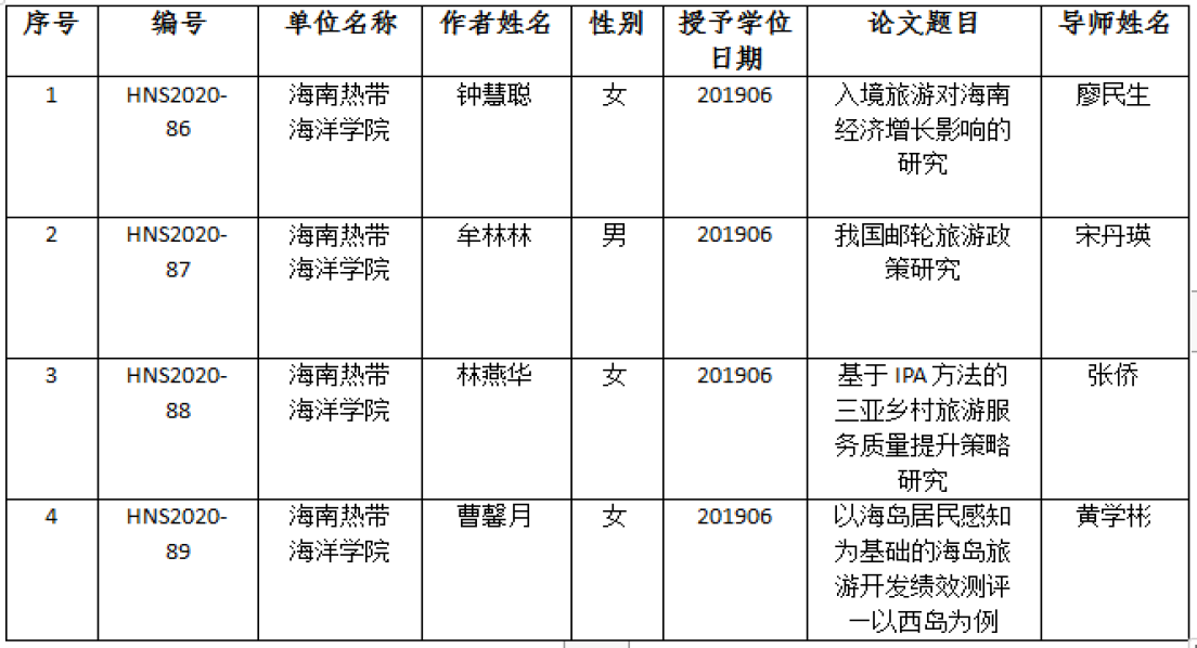 此外,根据《海南省教育厅关于组织开展2020年海南省优秀博士、硕士学位论文评选工作的通知》(琼教高〔2020〕162号)要求,近日,海南省教育厅组织开展了2020年省优秀博士、硕士学位论文评选活动。beats365官方唯一入口MTA研究生钟慧聪、牟林林、林燕华、曹馨月4位同学的毕业论文获评2020年海南省优秀硕士学位论文,指导老师分别为廖民生副董事长、宋丹瑛老师、张侨老师、黄学彬老师。