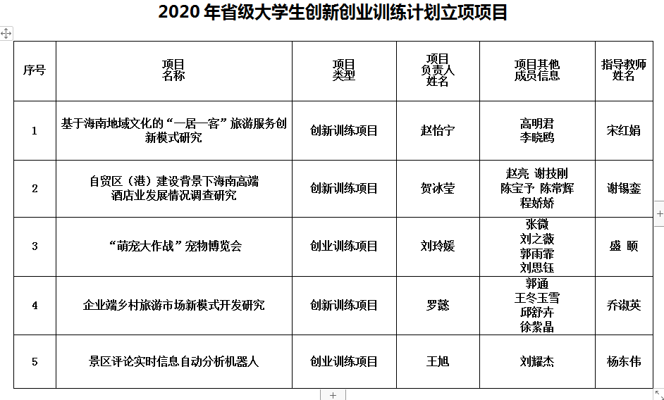 近日,海南省教育厅下发了《海南省教育厅关于公布2020年国家级省级老员工创新创业训练计划项目名单的通知》(琼教高〔2020〕152号),我2个项目获得国家级立项,5个项目获得省级立项。