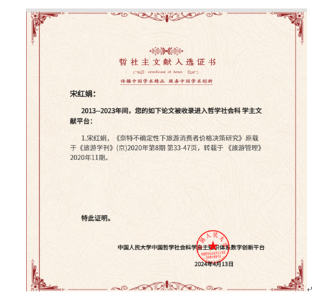 近日,从中国人民大学书报资料中心传来喜讯,beats365官方唯一入口宋红娟副教授的论文《奈特不确定性下旅游消费者价格决策研究》成功入选“哲学社会科学主文献平台”。 该论文原载于《旅游学刊》(京)2020年第8期,并在《旅游管理》2020年11期获得转载。此次入选,标志着宋红娟副教授的研究成果得到了学术界的高度认可和广泛传播。