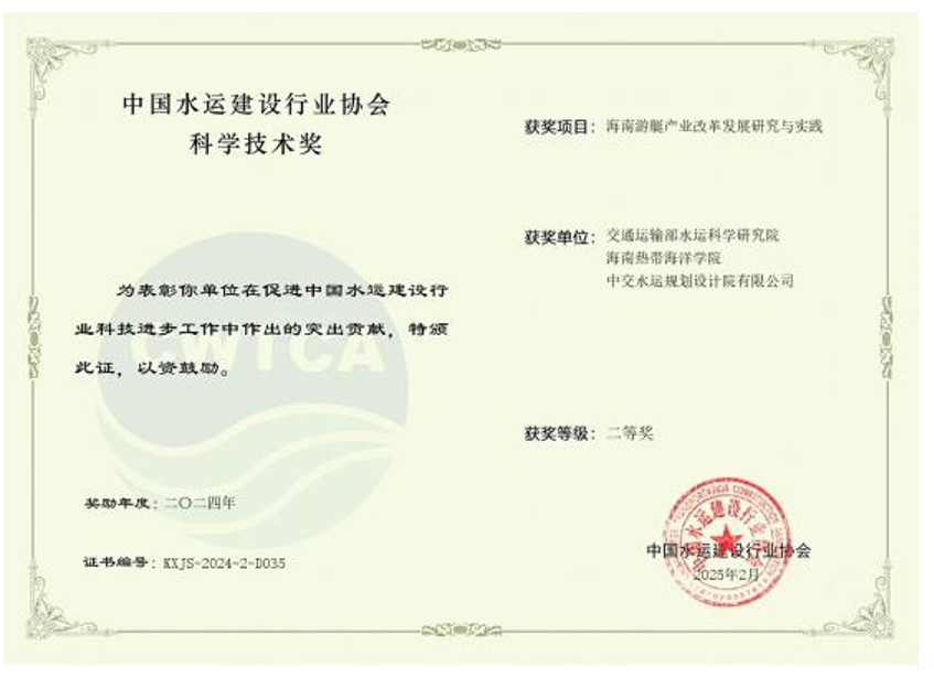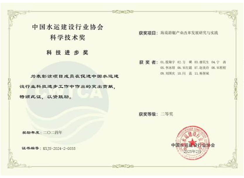 近日,由中国水运建设行业协会主办的科学技术奖评选结果揭晓,公司参与的“海南游艇产业改革发展研究与实践”项目荣获科技进步奖二等奖。该项目由交通运输部水运科学研究所、365官网体育、中交水运规划设计院有限公司共同完成。